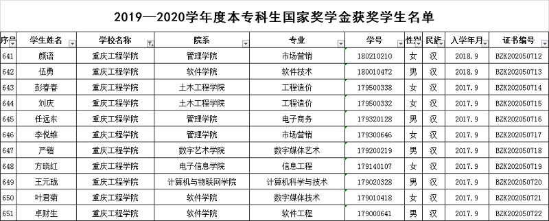 从今年9月份起,学校就全面启动了国家奖学金评选工作,按照学生管理办法要求,本次评选重点考查学生全年的等级认证考试成绩、参加竞赛获得奖项、参与公共事务、个人荣誉表彰等。10月22日,学校举行了2020年度国家奖学金评审会,由各二级学院推荐参评人选,候选人在台上通过现场演讲的方式汇报自己全年工作成绩,评审专家组根据综合表现进行评选,之后学校将候选名单报送市教委审核,无异议后上报教育部审批。经过了近3个月的层层选拔,最终,计算机与物联网学院学生王元珑,软件学院学生伍勇、叶君菊、卓财生,电子信息学院学生方晓红,数字艺术学院学生严锴,管理学院学生颜语、任远东、李悦维,土木工程学院学生彭春春、刘庆获评获评2020年国家奖学金。
