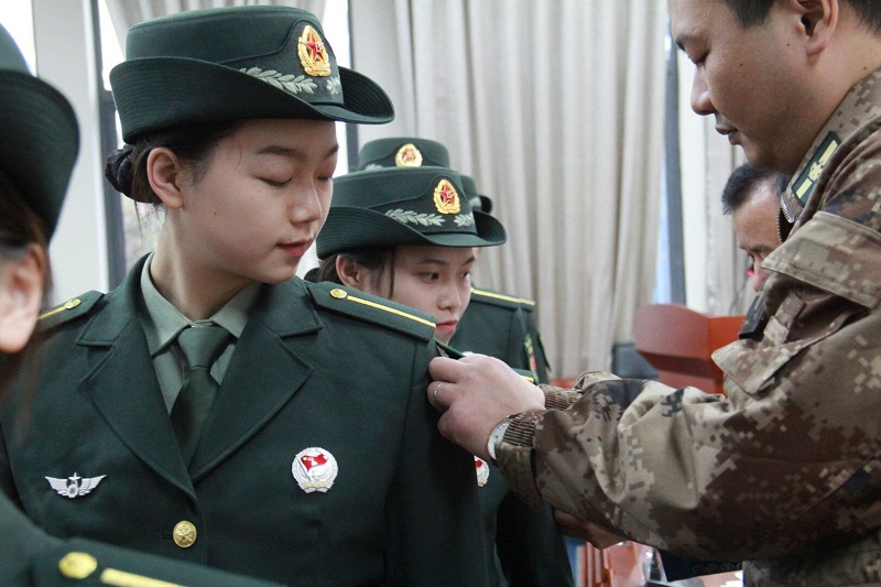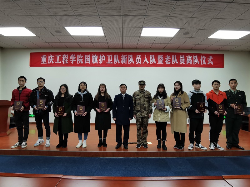 随后举行了新队员入队仪式,党委武装部部长熊力宣读了《关于批准2019级国旗护卫队刘浔等55名同学入队的通知》及《重庆工程学院国旗护卫队关于刘浔等同志职务任命的通知》。新队员们以崭新的面貌依次上台,由纪委唐小勇书记和武装部熊力部长为他们佩戴国旗臂章。