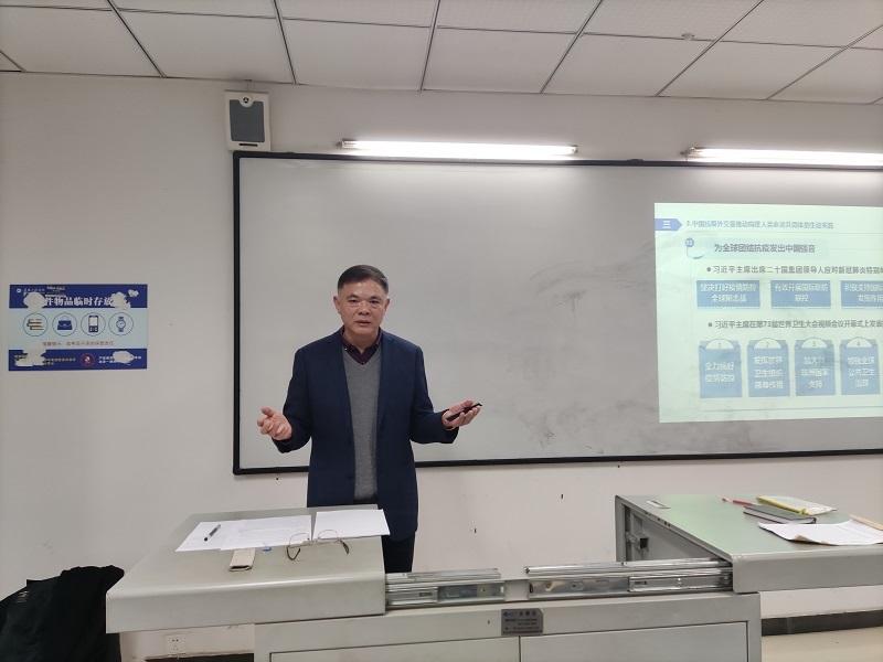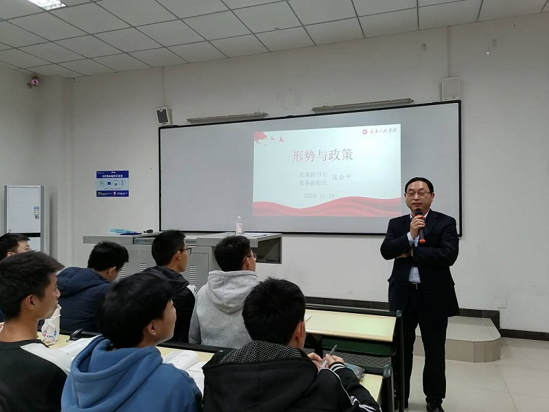 本网讯(文/图 思政部 黄炜)为深入贯彻落实习近平总书记在学校思想政治理论课教师座谈会上的讲话和中共中央办公厅、国务院办公厅《关于深化新时代学校思想政治理论课改革创新的若干意见》文件精神,进一步落实立德树人根本任务,提升思政课堂教学质量,11月9日至12月2日期间,校长桂国庆,党委书记兼督导专员谭明术,党委副书记兼常务副校长张业平,副校长王琼花、副校长蒋国华,纪委书记兼工会主席唐小勇,校长助理简玉刚、王建东等学校领导分别走上课堂讲台,为学生们讲述了一堂堂生动的《形势与政策》课。
