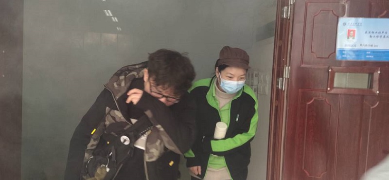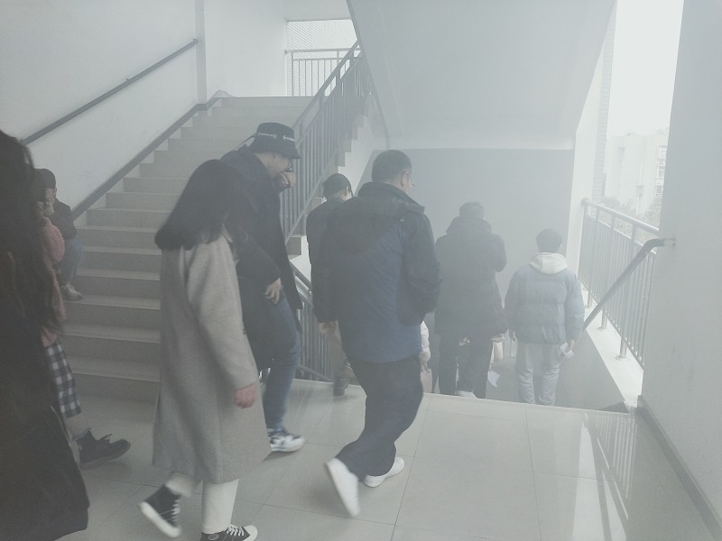在疏散逃生演练环节,活动现场模拟了重大烟雾突发事件场景。在余教官和保卫处老师们的专业指导下,全体老师和同学们按照学习的逃生办法和疏散流程,做到了安全、有序地撤离现场。