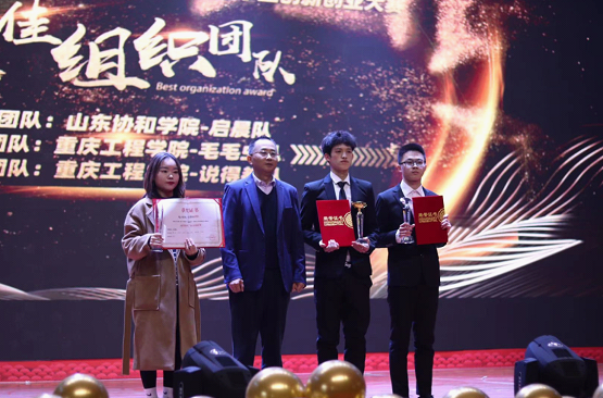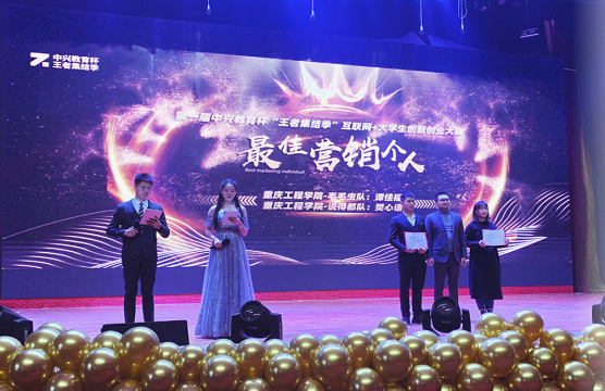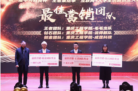 颁奖典礼分为想之光”、“雄鹰展翅”、“王者归来”三个序列篇章,双创大赛各类奖项获奖名单逐一揭晓。本次双创大赛共有23个成绩突出的团队获得最佳营销、最佳组织、最佳创新、优秀团队等奖项。我校毛毛虫队队长晏航和山东协和学院的启晨队队长张旭获得“最具领导力奖”,由他们带领的团队分别夺得本次大赛最佳营销团队奖的第一名和最佳组织团队奖的第一名。我校中兴ICT学院的卫节老师、山东协和学院的韩龙老师、昆明学院的王凤老师、重庆机电职业技术大学的周薇老师分别荣获了“优秀指导教师”荣誉。