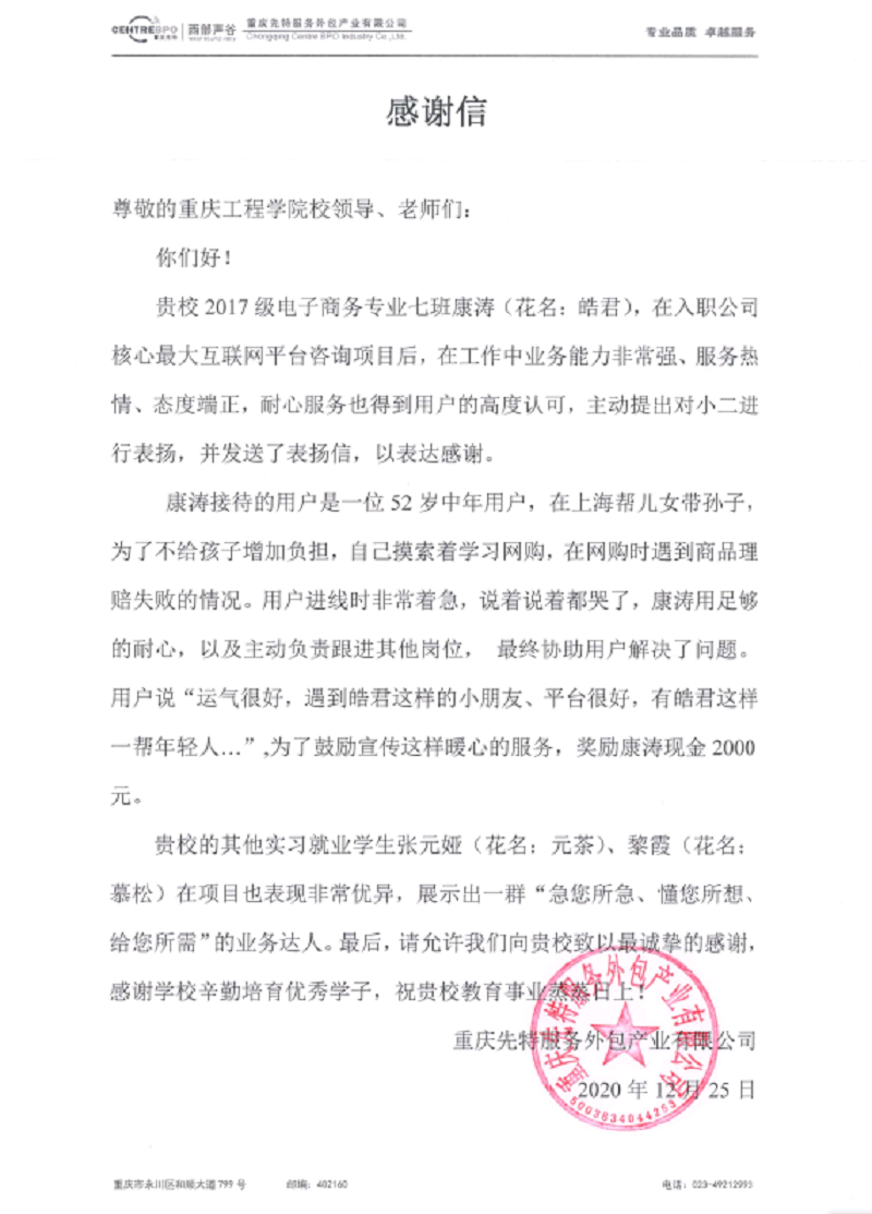 本网讯(文/图 管理学院 宋方伟)12月30日,重庆先特服务外包产业有限公司向我校寄来一封感谢信,对管理学院2017级电子商务专业学生在实习工作期间的突出表现给予高度评价,也向重庆工程学院培养和输送的优秀人才表示衷心感谢。