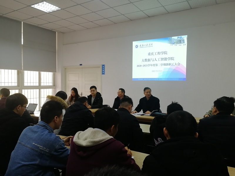大数据学院院长曹耀钦首先传达了学校干部大会的会议精神,并结合2021年学院目标任务书安排部署了本学期各项重点工作,重点布置了学院新学期疫情防控、师德师风、安全稳定等工作要求。曹院长强调,本年度各项工作都要围绕本科合格评估这这一核心工作展开,全体教师要对照目标任务书提前做好谋划,认真对照各项指标,高质量、高标准完成教育教学任务,扎实有效推进工作开展。学院党支部副书记尚伟、副院长陈欣、杨倩分别从党建、学风、就业、教学、科研、校企合作等工作对本学期的总体要求作了补充。