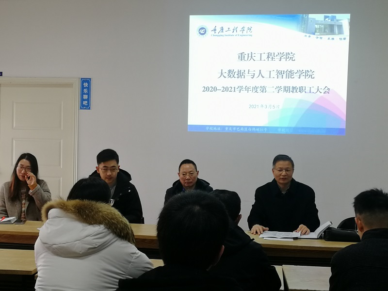 本网讯(文/大数据学院 唐蕾 图/大数据学院 刘雪梅)3月5日,大数据与人工智能学院在大学生服务中心组织召开了学院2021年教职工大会。学校党委书记谭明术出席,会议由学院党支部副书记尚伟主持,全院教职工参加。