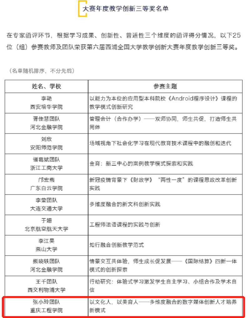 第六届西浦全国大学教学创新大赛于2020年8月1日正式启动,共有来自南开大学、西安交通大学、哈尔滨工业大学、北京航空航天大学、湖南大学等高校选送的361组教师团队981名教师参赛。创新大赛历经资料初审、大众投票、实地调研、专家评审等环节的严格评审筛选后,最终评选出特等奖、一等奖、二等奖共20组,三等奖25组。我校张小玲老师团队项目“以文化人、以美育人——多维度融合的数字媒体创新人才培养新模式”在学习成果、创新性、普适性等方面获得专家组的一致认可,经过激烈比拼后,最终斩获全国三等奖,这也是重庆市高校参赛团队中唯一获奖团队。