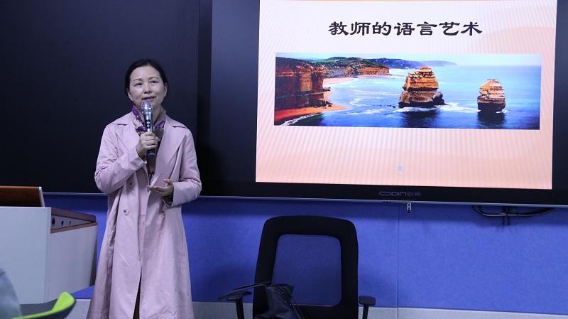 培训会上,骆教授首先通过举例和展示图片来解释语言表达中的知识障碍、文化障碍和心理障碍,再借用传话小游戏生动形象解释说话中的漏斗效应,以及如何通过改变说话的态度、方法、策略来避免沟通畅的问题。接下来,骆教授还阐述了教师语言表达中常见的七类问题:即语言习惯、内容、思路、处理、对象、角度、态度问题,并从教师发音、发声技巧,语速、语气调整,语言内容,说话场合、对方的需求和性格等方面提供了有效解决方案。骆教授强调,教师教学时要深入浅出、化难为易,体现传授智慧,同时也应该换位思考地与学生沟通,学会用心倾听学生。最后,骆教授总结道,教师只有掌握语言的艺术与技巧,把学生放在心上,才能做到更好的沟通。
