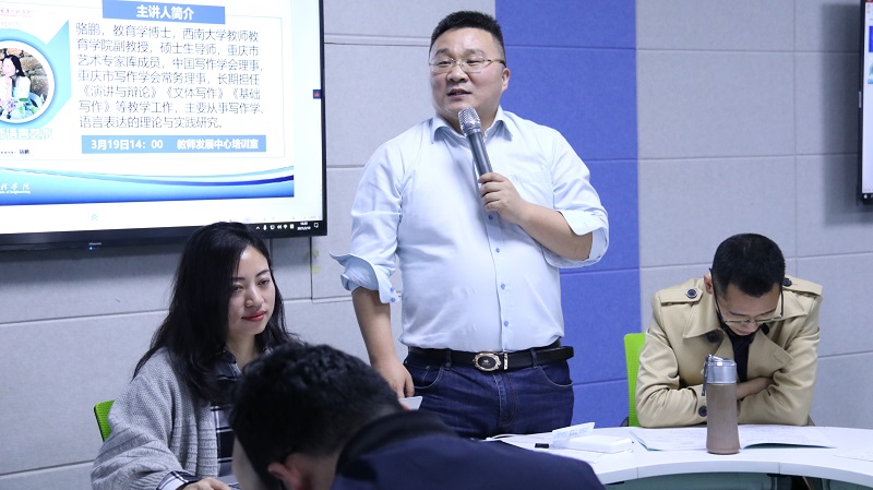 本网讯(文/教师发展中心 陈可 图/大学生记者团 官成成)3月19日下午,人事处(教师发展中心)在南泉校区图书馆一楼的智慧教室举办了“教师语言艺术”专题培训,西南大学教师教育学院副教授骆鹏博士应邀担任主讲人。本次培训工作分为现场培训和网络直播同步进行,2021年全体新入职教师和指导教师参加现场培训,其余没有教学任务的专任教师通过网络直播观看培训,共计357人参训。