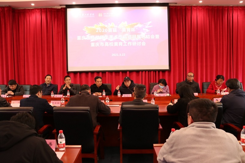 开幕式结束后,重庆市高等教育学会美育专业委员会成员及校长助理杨桂、相关职能部门负责人、二级学院书记、副院长在行政楼第五会议室组织召开了美术作品巡展总结会暨美育教育研讨会。