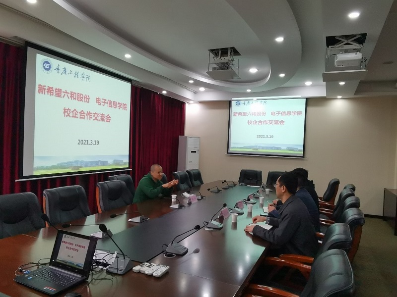 会上,黄苹总监就企业发展、用人需求、员工发展等方面做了详细介绍。他提到,目前企业对专业技术人才需求量很大,在经历了产业自动化之后,对电子信息专业、自动化专业人才需求迫切。另外,新希望六和股份有限公司面临人才结构调整,黄苹代表公司向电子信息学院表达了建立长期合作的意向,希望能引进一批具有专业技术的本科毕业生为企业注入新鲜血液。学院党总支书记谭思宇介绍了2021届毕业生的就业情况,副院长陈成瑞对学院开设专业、开设课程、产教融合方式作了详细介绍,校企双方对就业基地建设、校企合作、课题研究等事宜进行洽谈并形成初步意向。