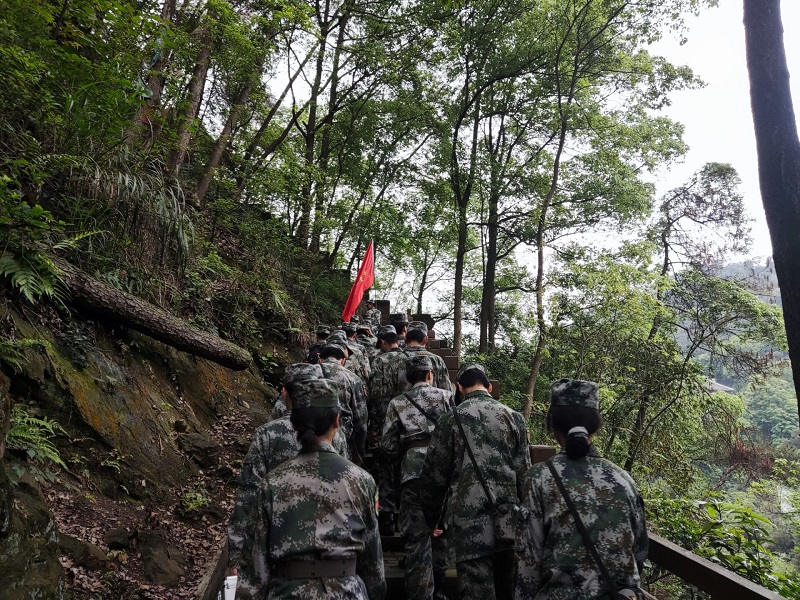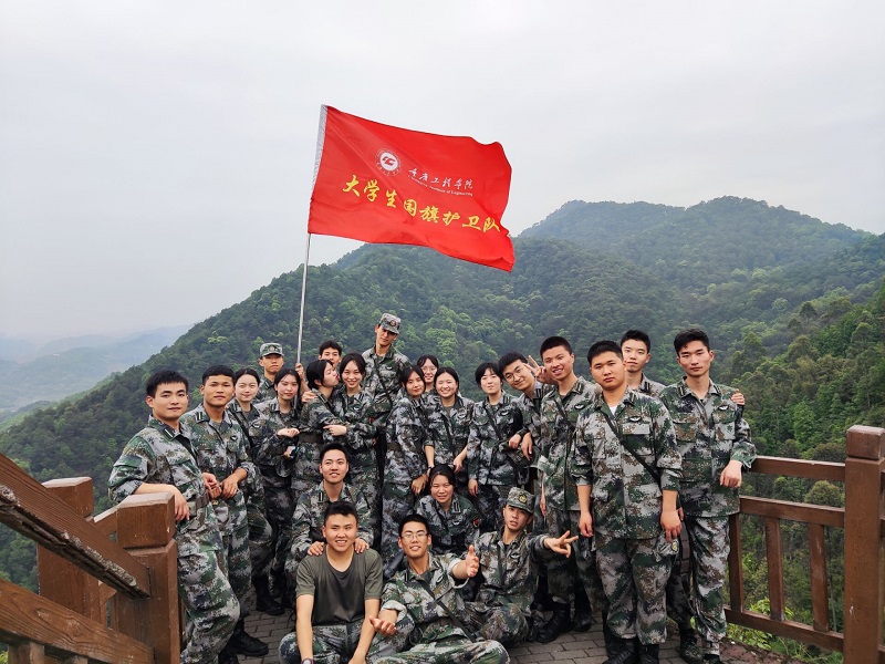 拉练途中,队员们精神饱满,情绪高涨,充分展示了重工学子昂扬向上的精神面貌。飘扬的旗帜,整齐的队伍,响亮的口号成为沿途一道亮丽的风景。为保障本次拉练活动安全有序进行,从前期策划到路线勘察、药品准备到安全保障、用餐饮水及应急处置,均有指导老师和学生干部专门负责。经过3个多小时的长途拉练,护卫队成员们于下午16:30分左右抵达了和尚山峰顶,参观了解放重庆打响“第一枪”的战斗遗址瞻仰了战斗纪念碑。队员们一路上不抛弃、不放弃,顽强地挑战着身体的极限,不断地超越着自我,彰显重工学子的坚韧与毅力。