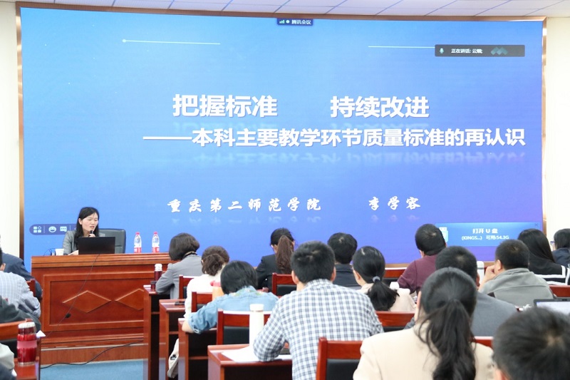 本网讯(文/教师发展中心 张晓颖 图/大学生记者团 官成成)为强化课堂教学规范,切实提高教育教学质量和落实人才培养目标,4月22日下午,由教务处、人事处共同举办的“课堂教学规范”培训讲座正式启动。本次讲座邀请到重庆第二师范大学教授,教师教育学院院长李学容教授来校进行培训,地点以南泉校区为主会场,运用企业微信与双桥校区进行视频连线。培训活动由教师发展中心副主任陈可主持,各二级学院教师、相关职能员工共计100余人参加。