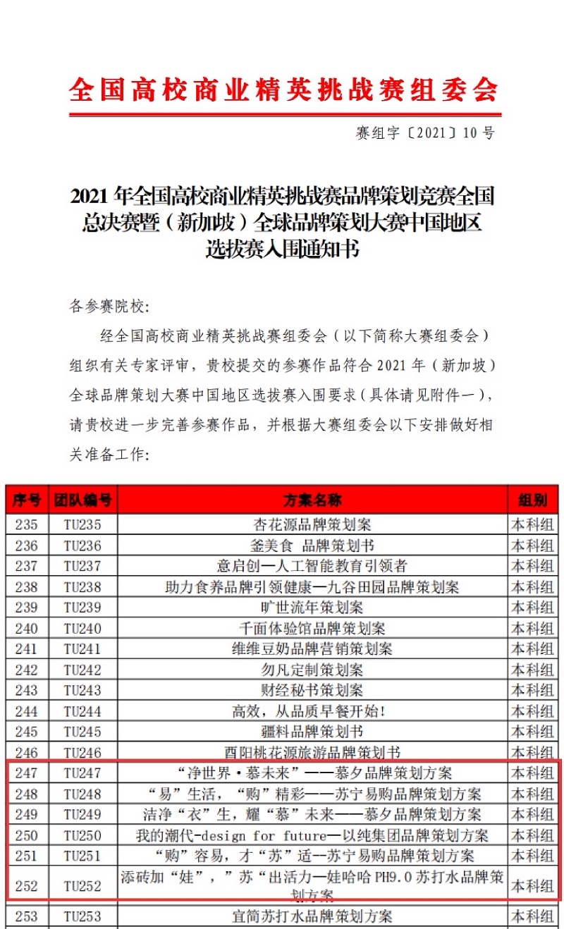 本网讯(文/图 管理学院 荣菁菁)4月15日,管理学院组织100余名市场营销专业学生参加了2021年全国高校商业精英挑战赛品牌策划竞赛全国总决赛暨(新加坡)全球品牌策划大赛中国地区选拔赛,4月10日—4月14日,组委会组织相关专家对全国200多所院校作品进行线上匿名评审,4月15日发布了国赛入围名单。此次比赛以线上形式进行,基于产学合作模式,采取团体赛模式,由3-5名选手和1-2名辅导老师组成,采取品牌策划方案撰写与现场答辩的方式进行。管理学院领导高度重视此次赛事,并广泛发动师生参赛,最终18级市场营销专业六支团队成功入围2021年全国高校商业精英挑战赛品牌策划竞赛全国总决赛,与山东大学、中国农业大学等985/211高校同台竞技。