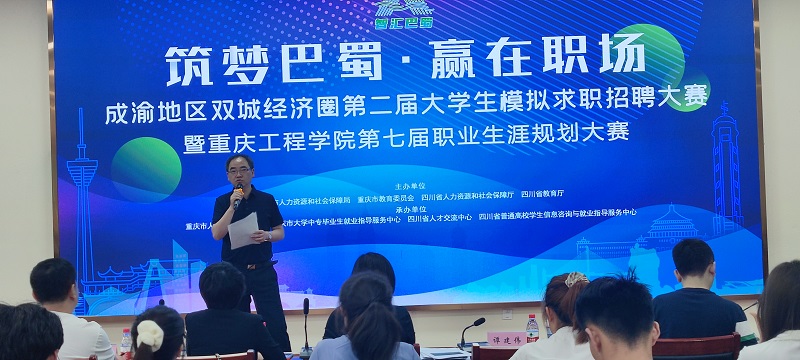 本网讯(文/图 招就处 叶秋清)为培养在校生职业生涯规划意识,树立良好的就业观,增强职业胜任力和就业竞争力,5月12日下午,我校举办了“成渝地区双城经济圈第二届大学生模拟求职招聘大赛暨重庆工程学院第七届职业生涯规划大赛”校级决赛。本次大赛邀请到了重庆理工大学管理学院人力资源管理系主任谭建伟教授、重庆中航集团人力资源经理邱爽、重庆微铭汇信息技术有限公司总经理助理冉宏德,我校素质教育中心主任邹春霞、招生就业处副处长吴优共同担任评委。