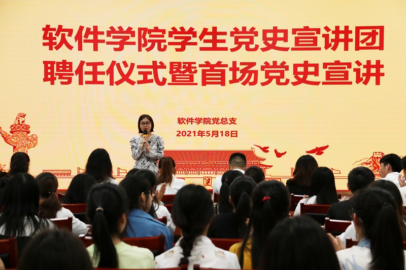 本网讯(文/软件学院 黄梅 图/大学生记者团 袁艺谋)5月18日下午,软件学院学生党史宣讲团聘任仪式暨首场党史宣讲在新办公楼201会议室举行。软件学院党总支书记刘子菱出席,学院学生党支部发展对象、党员及党史宣讲团成员共百余人参加活动。