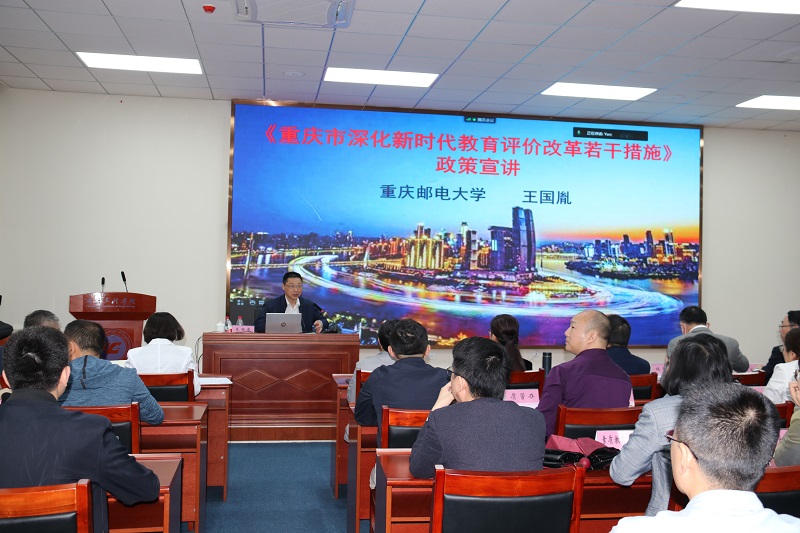 本网讯(文/党政办 邹均 图/大学生记者团 袁艺谋)5月26日上午,我校组织召开了《重庆市深化新时代教育评价改革若干措施》(以下简称《若干措施》)宣讲会,重庆邮电大学副校长王国胤教授应邀来校进行宣讲,全校中层以上干部、各学院师生代表共计100余人参加宣讲会,会议由校长桂国庆主持。
