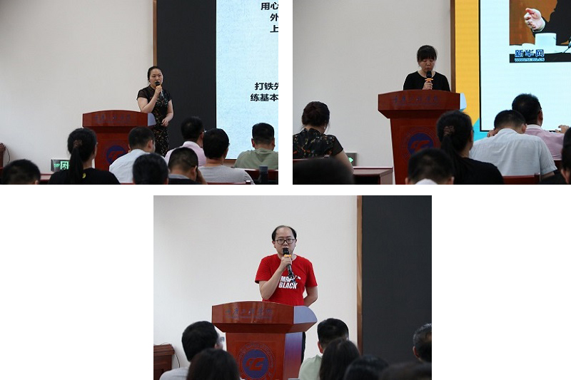 在分享师德师风先进事迹环节,龙丹老师从“业精为师、德高为范、艺娴为尊”三个方面进行解读;王薇老师引用经典古诗词阐述了作为“学生青春摆渡人”的三重境界;赵商老师以“修德长技”为切入点,从关爱学生、爱岗敬业、服务社会三个角度分析如何成能为一名令党和人民满意的好教师。