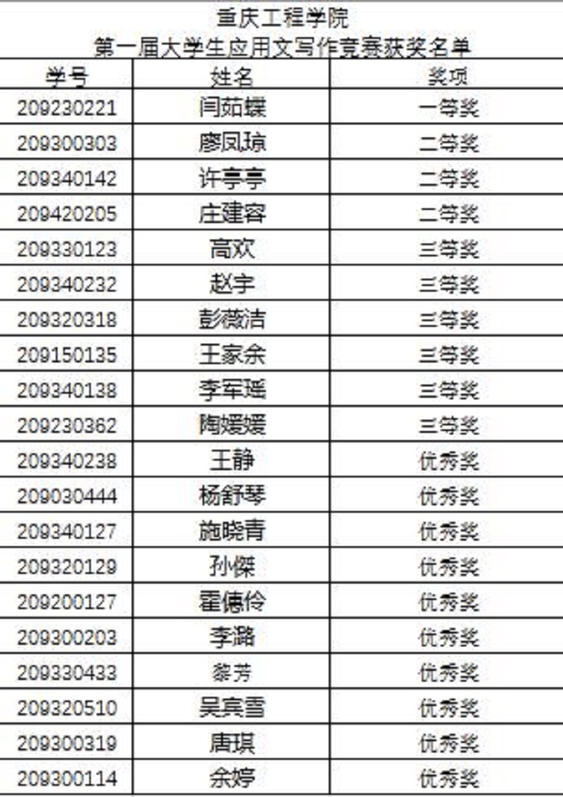 比赛分为初赛和决赛两场,试题分别参考了往届重庆市教委组织的公文大赛试题题型,主要有选择题、判断题、改错题、案例分析题、写作题等。在经过老师们严格评阅后,最终选出一等奖1名,二等奖3名,三等奖6名,优秀奖10名。此次比赛的获奖者,将有机会代表学校参加重庆市教委举办的重庆市高校大学生应用文写作大赛。