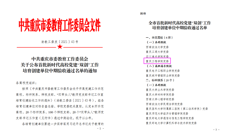 本网讯(文/图 组织部 李毅)近日,中共重庆市委教育工作委员会下发《关于公布首批新时代高校党建“双创”工作培育创建单位中期验收通过名单的通知》(渝教工委发〔2021〕43号),我校顺利通过“重庆市首批新时代高校党建‘双创’示范高校”中期验收,是重庆市唯一一所民办高校党建工作示范校。