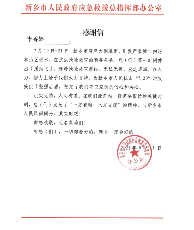 本网讯(文/图 大数据学院 王惠俊)2021年8月,新乡市人民政府应急救援总指挥部办公室向我校19大数据技1班李香婷同学发来感谢信,表扬其在河南新乡抗洪抢险救灾过程中无私无畏的奉献精神。