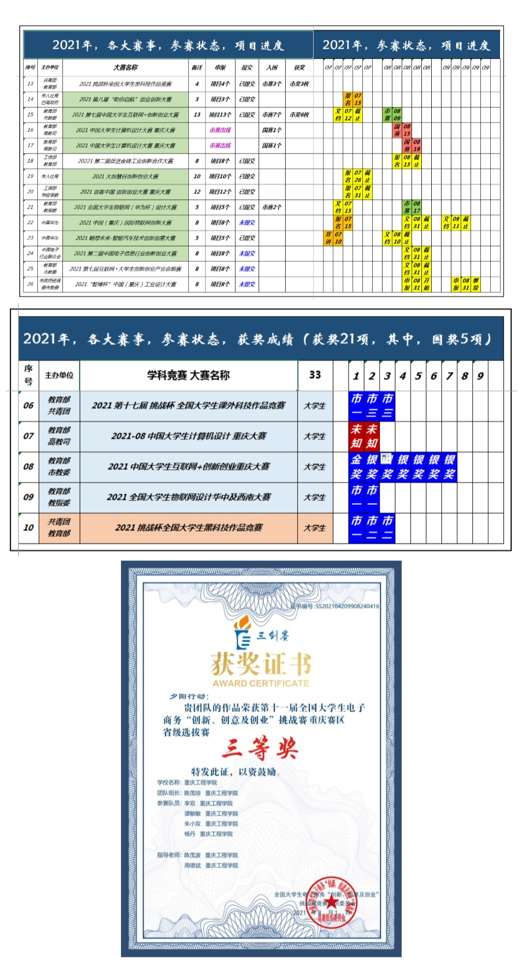 挑战杯课外科技作品竞赛,获重庆赛区(学校唯一的)一等奖1项,三等奖2项。