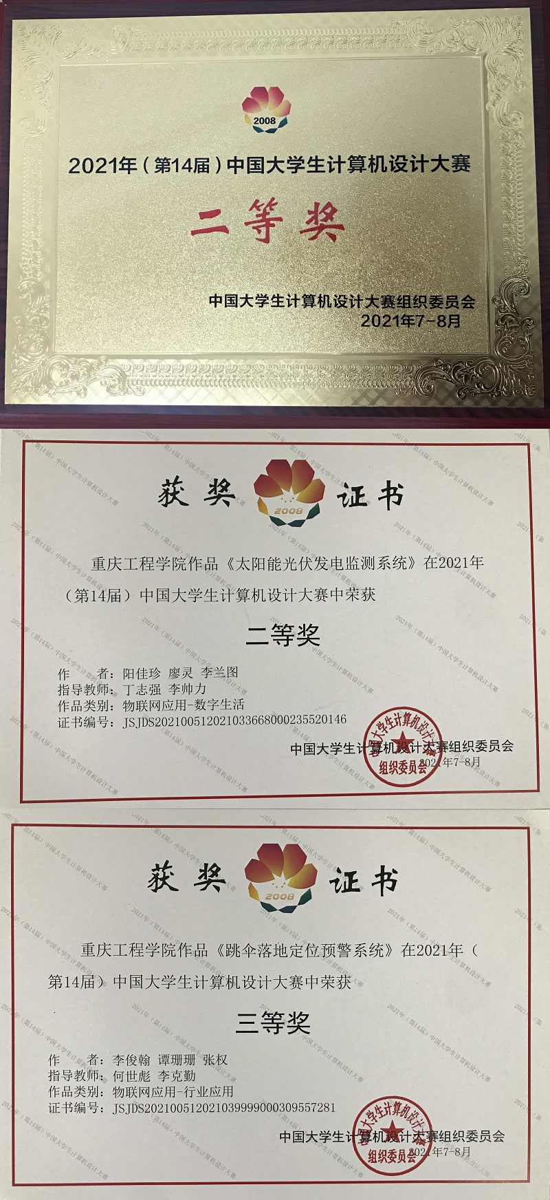2021年(第14届)中国大学生计算机设计大赛(厦门决赛区)与2021年8月19日至2021年8月21日在福建工程学院举行。我校参赛学子认真备战,指导教师精心指导,与全国重点高校参赛队伍同台竞技,取得了优异的成绩。我校计算机学院和电子信息学院共三支队伍从市级赛中脱颖而出入围本次全国总决赛物联网应用组。21日下午,组委会公布获奖名单。其中,我校计算机学院阳佳珍、廖灵和李兰图等人的作品“太阳能光伏发电监测系统”斩获物联网应用组全国二等奖,电子信息学院李俊翰、谭珊珊和张权等人的作品“降落伞定位系统”斩获物联网应用组全国三等奖。