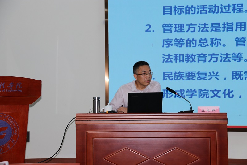 在主题讲座阶段,学校邀请了重庆三峡学院数学与统计学院院长兼党总支副书记王良伟教授为全体与会人员作了题为 “普通高校中层干部管理的方法与效能(以二级学院为例)”的报告。王教授以重庆三峡学院数学与统计学院的实际情况为例,围绕学院文化、教学管理与专业建设、科研管理与学科建设、师资队伍建设、二级学院与行政部门关系等方面,深入浅出的分析了普通高校中层干部管理的方法与效能,丰富的内容让与会干部受益匪浅,获益良多;在交流环节,王教授解答了大家在工作中遇到的困惑与疑虑,分享了在促进学生考研、学生课外培养、稳定高层次人才、凝聚团队力量、学科培训、校企合作、教师技能培训等方面的经验。校长桂国庆代表学校感谢王教授的精彩报告,认为本次报告对工程学院干部职工今后工作具有积极意义和作用,为学校干部管理及发展启发了新的思考。桂校长要求全体与会学校干部要以身作则,亲力亲为,各司其职,敢于破唯,大胆开展工作,加强交流沟通,认真思考工作抓什么,怎么抓;职能部门树立好服务意识,认真学习政策,及时了解国家政策、相关主管部门政策及具体开展工作的要求,同时要加强横向比较分析和考察学习。