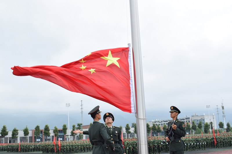 足球场上“青春似火,超越自我,放飞梦想,创造辉煌”“学军人之风采,强自身之素质”的标语振奋人心,随着庄严的国歌声响起,全体肃立,众人齐声高唱国歌,向冉冉升起的国旗行注目礼。