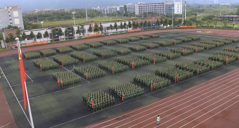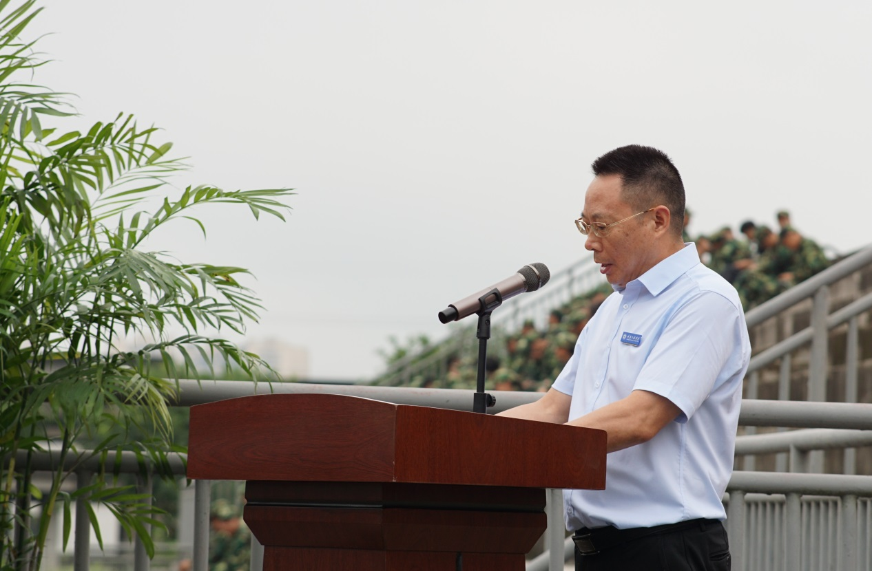 谭明术以“奋斗所在处,青春恰自来”为题发表讲话,对2021级4000余名新同学表示欢迎;对承担此次新生军训任务的巴南区人武部教官和学校国旗护卫队的教官表示感谢;对在军训中取得优异成绩,受到表彰的先进单位和个人表示祝贺。