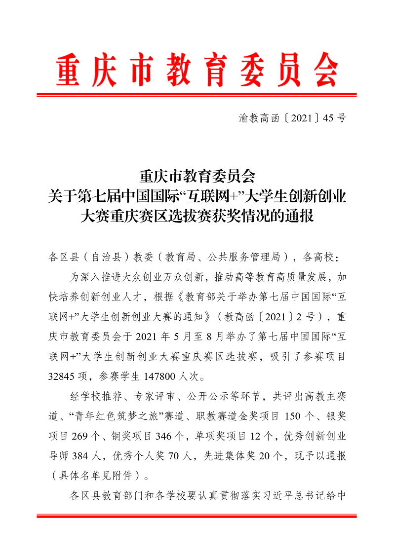 本网讯(文/图 创新创业学院 陈郁欣)近日,重庆市教育委员会公布了关于第七届中国国际“互联网+”大学生创新创业大赛重庆赛区选拔赛获奖情况,我校在报名人数、报名项目、推荐市赛项目数、获奖项目数等方面都取得了显著突破。参赛项目数和报名人数在全市所有高校中排名第四,推荐市赛项目数也领先同类型学校。最终在高教主赛道获得金奖1项,银奖11项,铜奖7项;在“青年筑梦红色之旅”赛道获得银奖2项,铜奖1项。其中,市赛金奖项目《无网覆盖天地通》已入围全国总决赛,将继续争夺国赛奖项。