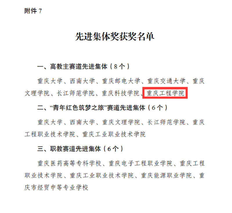 由于在本次比赛组织中积极表现,我校被市教委评为了高教主赛道高教主赛道先进集体,是高教主赛道八个先进集体中唯一一所民办本科院校,这是对我校比赛组织工作的肯定。不忘初心,砥砺前行。今天的收获是过去不懈奋斗、不断进步的结果。我校将继续坚持“以创新促学业、以创新促创业、以创新促就业”的基本理念和“创新创业与专业教学相结合、创新创业与实习实训相结合、创新创业与素质教育相结合”的工作思路,将创新创业教育融入人才培养全过程,加强“理论基础好、综合素质高、专业能力强”应用型高级专门人才培养。