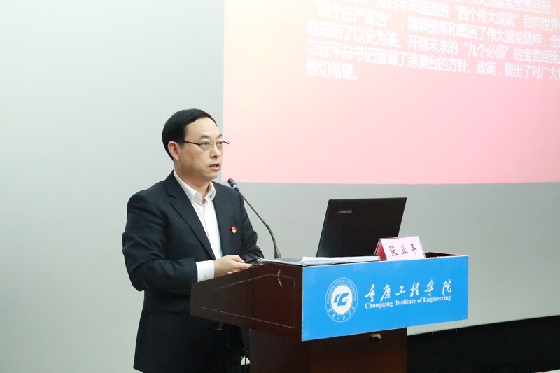 本网讯(文/图 数字艺术学院 李毅)为深入学习贯彻习近平总书记在庆祝中国共产党成立100周年大会上的重要讲话精神,推动“四史”学习教育深入开展,按照学校党委的要求, 10月22日下午,数字艺术学院党总支在阶梯报告厅举行了深入贯彻学习习近平总书记“七一”重要讲话精神宣讲会。本次宣讲会由党委副书记兼常务副校长张业平主讲,数字艺术学院党总支书记徐小辉主持,学院全体师生党员、民主党派代表、教师及学生代表共150余人参加本次活动,报告会历时近2小时。