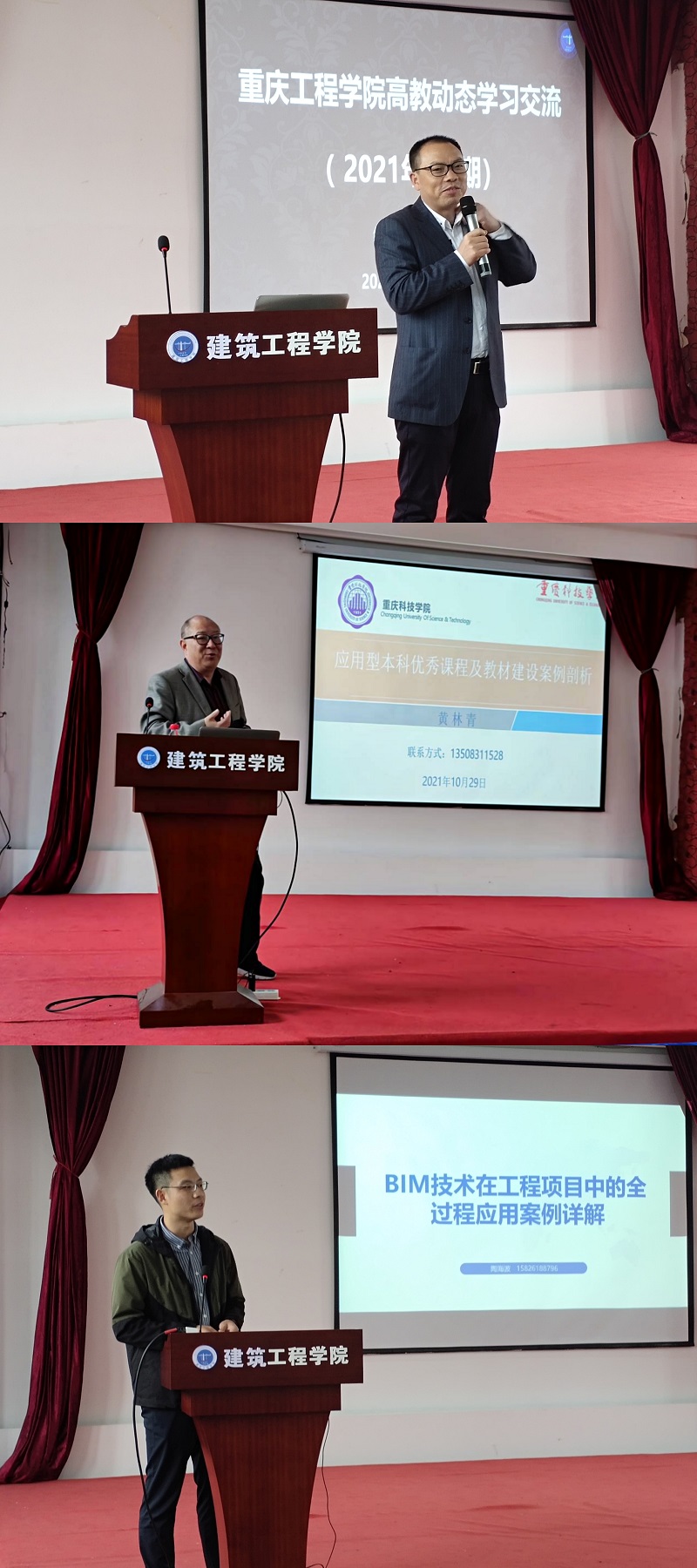 重庆科技学院建筑工程学院院长黄林青教授用他多年的丰富的工作经验向全体教师讲述应用型本科优秀课程应当如何来做,从课程建设平台、课程思政、课程教材等多方面案例的剖析,为我院今后建设优秀课程提出了宝贵意见。中煤科工集团重庆设计研究院有限公司BIM中心主任、高级工程师陶海波用他亲历的各种案例向教师们清晰地诠释了多年以来BIM在工程项目中的各方面应用,并对未来BIM技术在建筑工程全过程的深入发展进行了展望。同时,陶主任结合自身经验和社会的不断发展,指出当前社会对复合型人才有着极大的需求,鼓励同学们朝着具有工程背景、IT能力、项目管理能力的复合型人才发展。