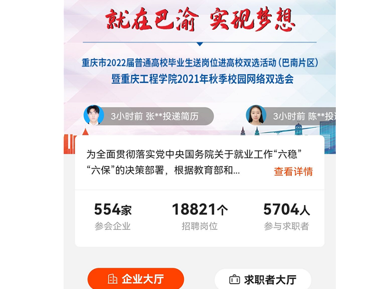 据悉,此次网络双选会是重庆工程学院“2022届毕业生校园招聘月”系列活动之一,接下来还有校内专场招聘、就业指导讲座等多场活动,也是学校贯彻落实党中央、国务院“稳就业”、“保就业”决策部署,贯彻落实教育部、人社部2022届全国普通高校毕业生就业创业工作网络视频会议的具体举措。学校将继续提高政治站位、强化领导、夯实责任、多措并举促进2022届毕业生更加充分高质量就业,保持毕业生就业工作的连续稳定。