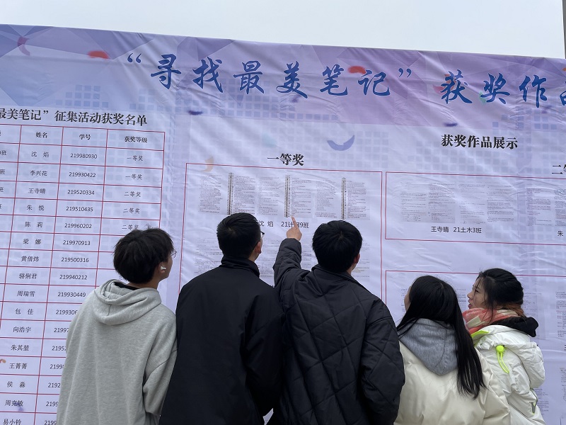 据了解,经过初筛,共有来自7个学院的80本笔记进入复赛,学校组织相关部门老师、辅导员、学生会干部、学生代表等相关人员进行评选,从笔记内容、笔记展现形式、笔记主题和记笔记方法等方面严格把关,共选出了优秀笔记20本,评选出了2名一等奖、3名二等奖、5名三等奖和10名优秀奖。值得一提的是,为了鼓励更多学生好记笔记、记好笔记,校区加大了表彰宣传力度,将20本优秀笔记在学术报告厅门口进行展览。