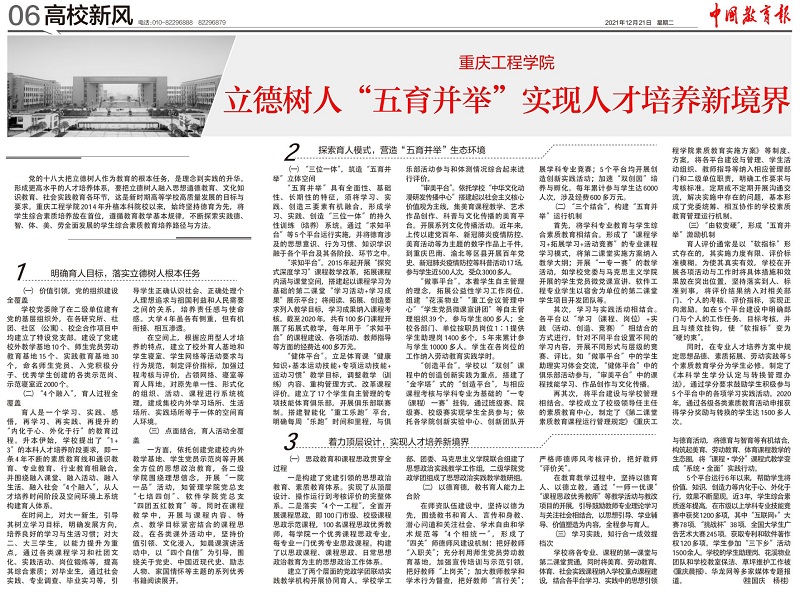 本网讯(文/党委宣传部)12月21日《中国教育报》半版刊发了我校校长桂国庆和校长助理杨桂署名文章《立德树人 “五育并举” 实现人才培养新境界》,大篇幅报道了我校教学工作。
