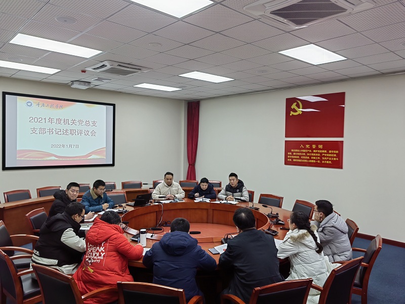 本网讯(文/图 机关党总支 黄涛)为不断提升我校机关党总支党建工作科学化、规范化水平,根据中共重庆市委教育工作委员会《关于开展2021年度高校和直属单位党组织书记抓基层党建述职评议考核工作的通知》(渝教工委函〔2021〕228号)文件精神, 1月7日下午,机关党总支在行政楼107会议室举行2021年支部书记述职评议会,总支全体委员、各支部书记参与会议。