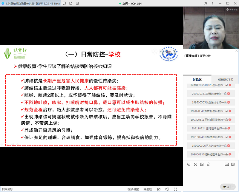 首先,由重庆市结核病防治所主任医师刘英给同学们带来了“高校结核病防控那些事儿”线上专题讲座,刘主任从如何早期发现学校结核病、如何开展学校结核防控、你必须了解的防治知识等方面深入浅出的讲解了结核病相关知识,全校6700余人进入线上课堂学习。