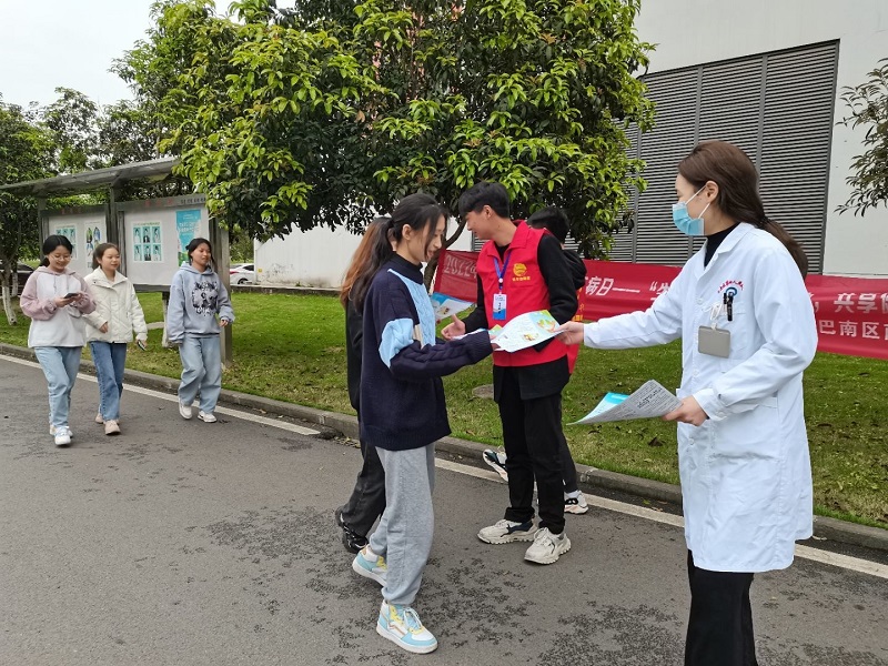 紧接着,我校志愿者同学与巴南区第四人民医院医生,在和园5号广场派发了结核防治宣传资料,同时,医生们也对有疑问的同学进行了现场解答。