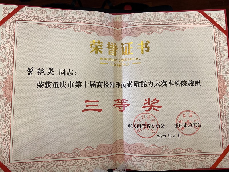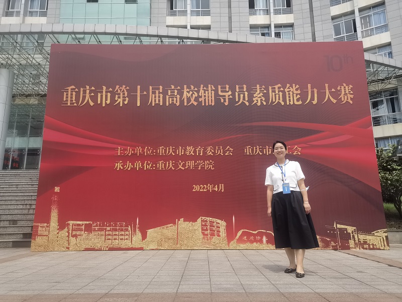 本网讯(文/图 管理学院 王燕楠)4月25日-27日,管理学院辅导员曾艳灵代表学校参加重庆市第十届高校辅导员老师素质能力大赛,在52名选手中力战群雄,综合成绩名列第17名,荣获三等奖。