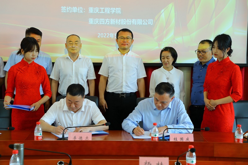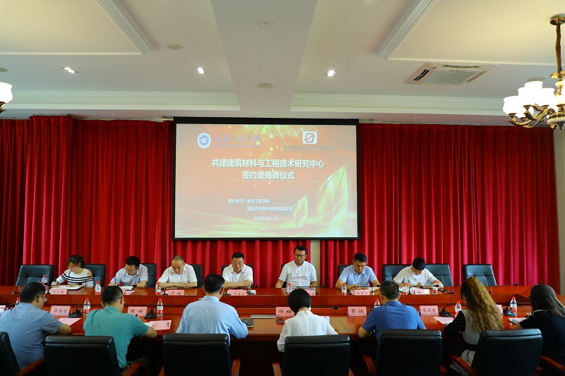 本网讯(文/ 建筑工程学院 窦广陵 潘竟阅 图/大学生记者团 贺兴登)5月12日下午,重庆工程学院与重庆四方新材股份有限公司(下称“四方新材”)共建“建筑材料与工程技术研究中心”(下称“中心”)签约暨揭牌仪式在我校第五会议室举行。四方新材董事长李德志、高级顾问卢健、副总裁兼董事会秘书李海明、总工程师白延平、四方建通科技有限公司总经理陈磊、研发部长杨翔,重庆工程学院校长桂国庆,副校长杨桂,科技处处长陈维,建筑工程学院院长雷江、副院长汪金能、办公室主任毛云莹、土木工程系副主任林俊以及部分教师代表出席了仪式。