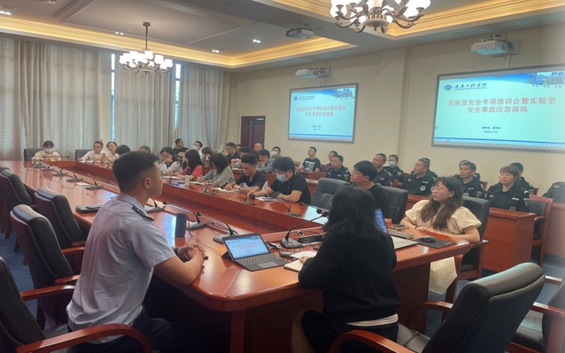 本网讯(文/图 教务处 罗兰 )5月23日中午,教务处会同保卫处在第五会议室组织召开实验室安全专项培训会,此次会议聘请重庆市利民防火宣传培训中心林阳教官为大家做消防专项培训。教务处、保卫处相关人员及各二级学院实验室管理员参加了本次培训会。会议由教务处副处长陈艳莲主持。