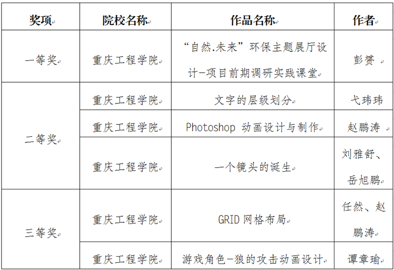 本网讯(文/ 党委宣传部)近日,第五届全国数字创意教学技能大赛(普通高等院校赛道)获奖名单公布,我校数字艺术学院、软件学院等多名教师荣获一、二、三等奖多项奖项,其中数字艺术学院彭赟老师的《“自然.未来”环保主题展厅设计-项目前期调研实践课堂》荣获环艺设计组一等奖。