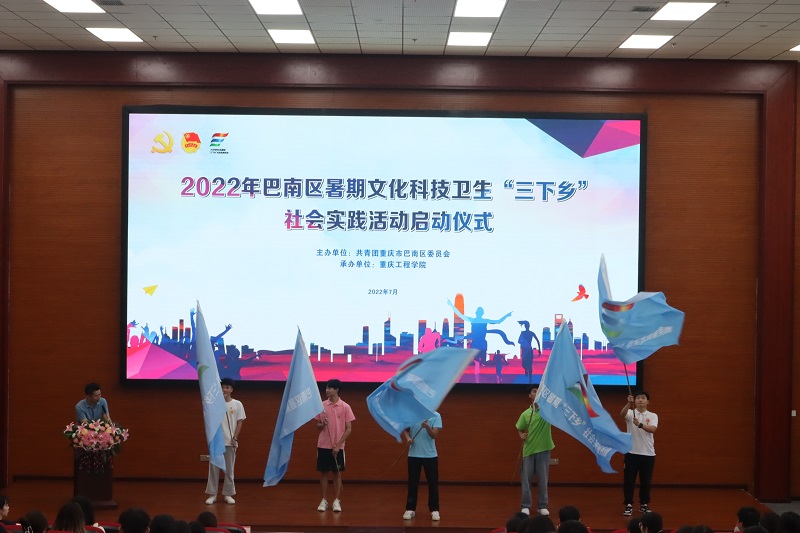 本网讯 (文/图 校团委 金质纯)为引导和帮助广大青年学生上好与现实相结合的“大思政课”,在服务实践中“喜迎二十大 永远跟党走 奋进新征程”,努力成长为堪当民族复兴大任的时代新人,7月11日下午,我校第七教学楼学术报告厅隆重举办2022年巴南区暑期文化科技卫生“三下乡”社会实践活动启动仪式,共青团重庆市巴南区委员会副书记冯文涛,学校党委委员、副校长王建东出席活动,相关镇街、高校团组织负责人以及“三下乡”社会实践队伍代表参加本次活动。