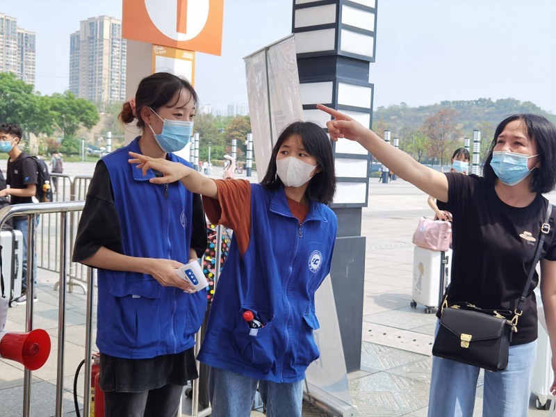 “来了吗?多少人?”是重工“蓝色引路人”两天来最关心的主题,也在传递着他们对2022级新生朴素且生动的真情实感。为完成学校迎新接待工作的相关要求,他们用自己的脚步和手举牌迎接每一位来自重庆市内外的新生,确保“不漏一人”是他们坚守的职责底线。他们的脑海里都是火车、大巴等车次的到达时间,用脚步丈量着每个场站的各个出口,双眼中全是在人流中穿梭的2022级重工萌新。在等待与忙碌之间,忘记了喝水和吃饭,忘记了汗湿的衣衫,一遍又一遍往返于场站各个点位,只为那一件蓝色马夹能第一时间出现在新生的眼前。