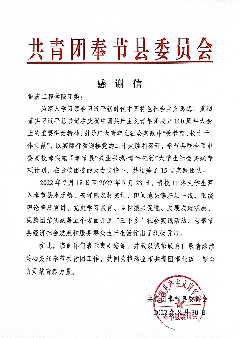 在贵校团委的大力支持下,2022年7月18日至2022年7月23日,贵校11名大学生深入奉节县永乐镇、安坪镇农村院坝、田间地头等基层一线开展“三下乡”社会实践活动,为奉节县经济社会发展和服务群众生活作出了积极贡献。在此,谨向你们表示衷心感谢,并致以诚挚敬意!恳请继续关心关注奉节共青团工作,共同为推动全市共青团事业迈上新台阶贡献青春力量。