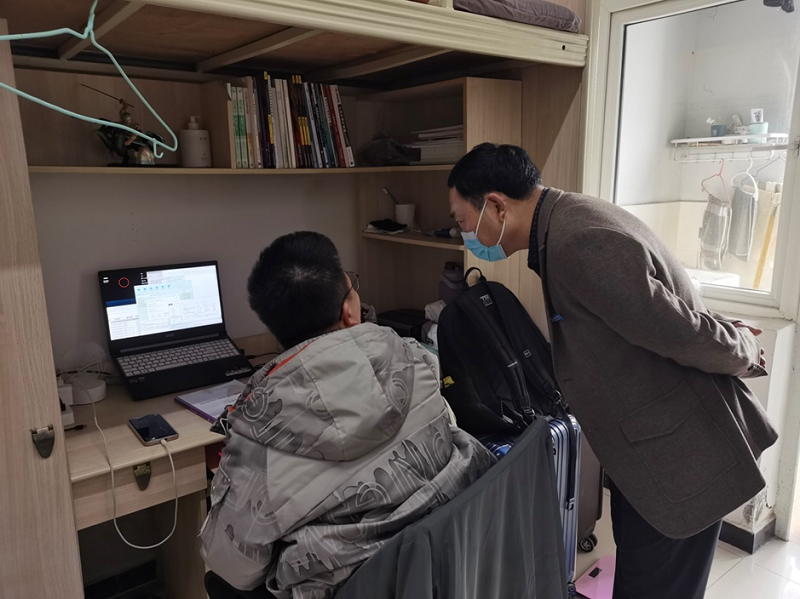 11月14日,党委书记、督导专员谭明术,党委副书记、常务副校长张业平带队检查了学校智慧实验室、智慧教室,并来到学生宿舍看望学生。谭明术对近期的线上教学、学生教育、生活物资保障、防疫物资保障等方面工作提出要求,要求学校各部门牢固树立学生为中心的服务意识,想学生所想,及时解决学生的合理诉求;全体师生要团结一心、共克时艰,坚决打赢疫情防控阻击战。