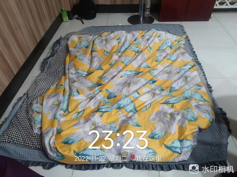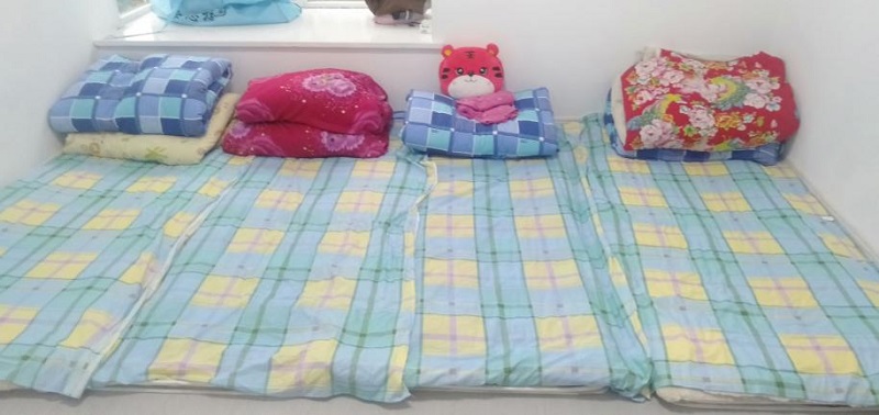 因为疫情的原因,所有工作人员都只能暂住在学校,但宿舍的床位有限,很多保洁阿姨都是在宿舍里打地铺,挤着一起睡。负责保洁阿姨管理工作的左玲老师说:“刚开始很多阿姨都有点不适应,没有床,只能借床单棉絮垫在地上,也没有换洗的衣服,真的很艰难,但没有一位阿姨说要离开!”