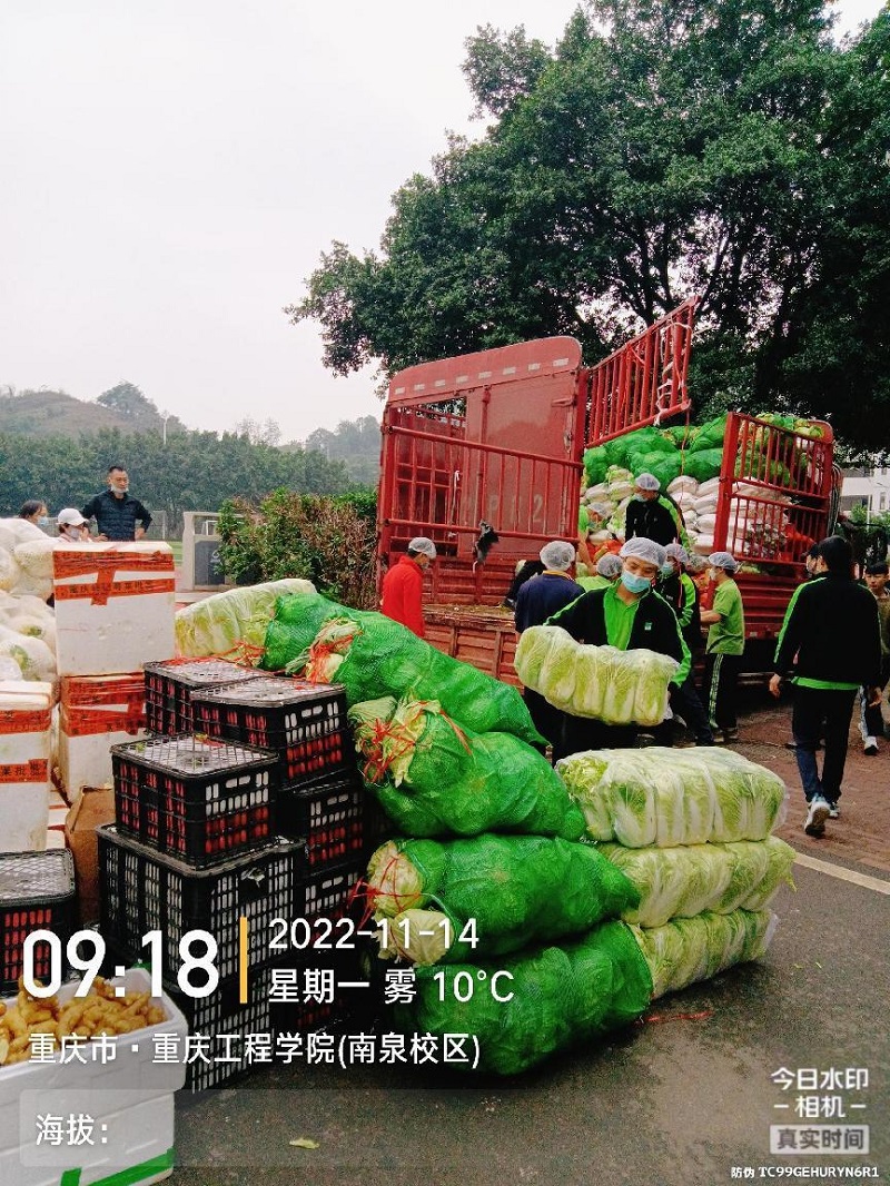 其次便是保供的工作,因为目前的疫情形势严峻,许多供应商都在封控中,不能向学校进货,食堂的蔬菜都是从基地摘好后立即往学校送。每个区域的进出要求不同,党政办主任邹均一直在与社区、街道沟通协调,尽量让货物正常运往学校,确保同学们能吃上饭,能正常购买商品。