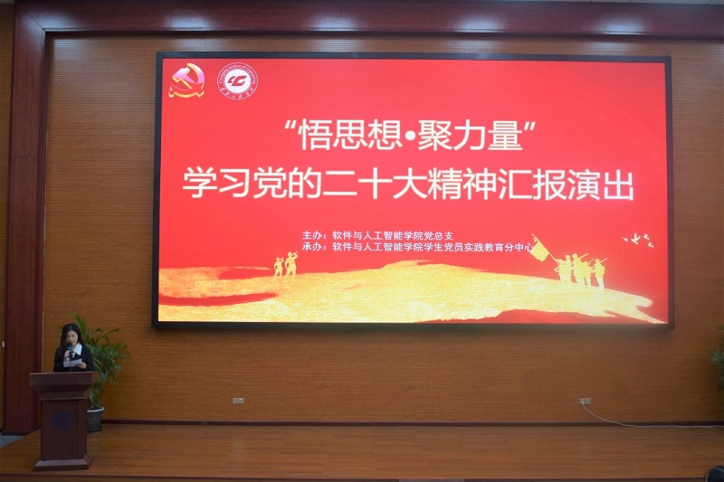 本网讯(文/图 软件与人工智能学院 宁丽丽)为认真学习贯彻党的二十大精神,继承和发扬党的优良传统和作风,11月26日,软件与人工智能学院党总支在信息大楼报告厅举行“悟思想•聚力量”学习党的二十大精神汇报演出。