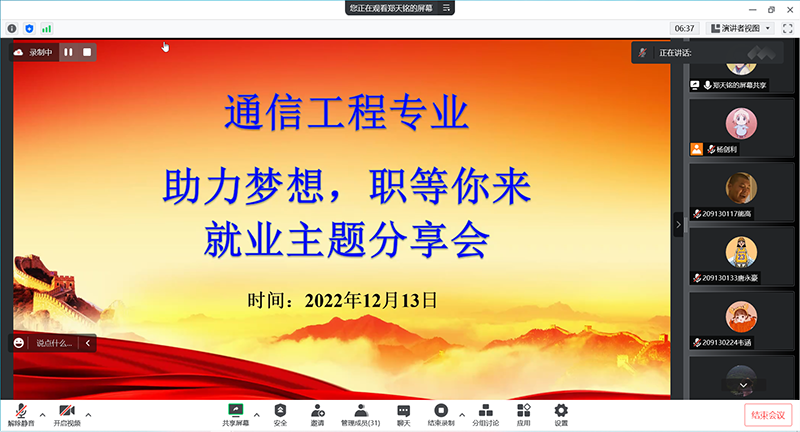 本网讯(文/图 电子信息学院 杨剑利)目前正值校招以及寒假实习的高峰期,为帮助通信工程专业同学们做好求职的准备,提升求职的技能水平,明确就业方向,更好为自己未来找到心仪的工作做好铺垫。12月13日晚,电子信息学院举办通信工程专业 “助力梦想,职等你来”就业主题分享会。本次分享会采用线上分享的方式。